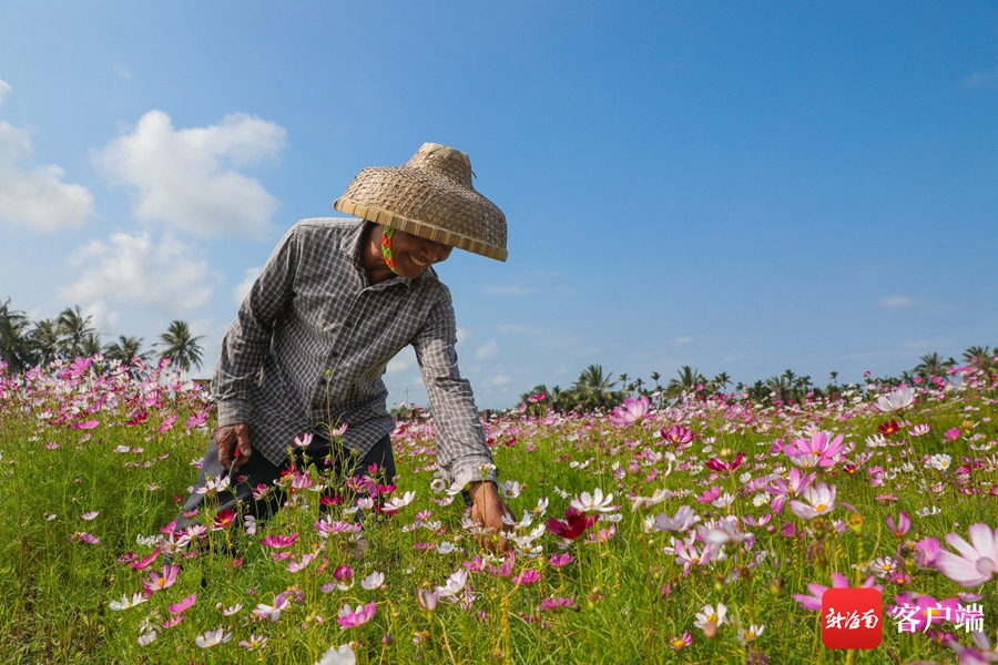 博鰲鎮南強村百畝花海內,村民在打理花草。記者 李昊 攝