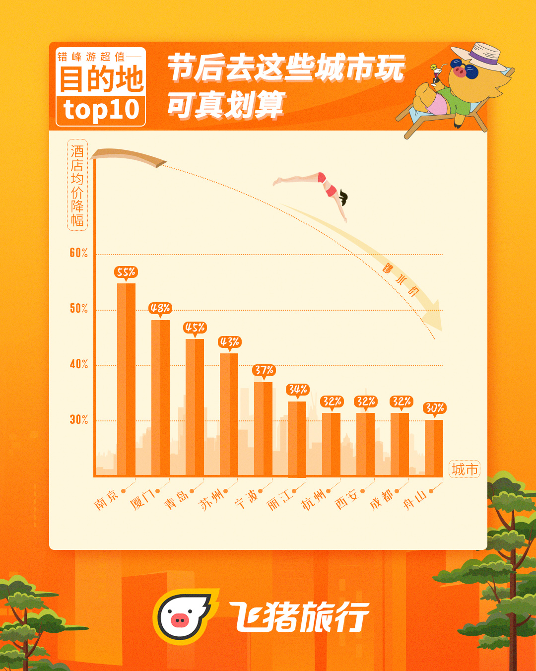 “五一”假期后,國內城市酒店均價降幅排行。飛豬提供