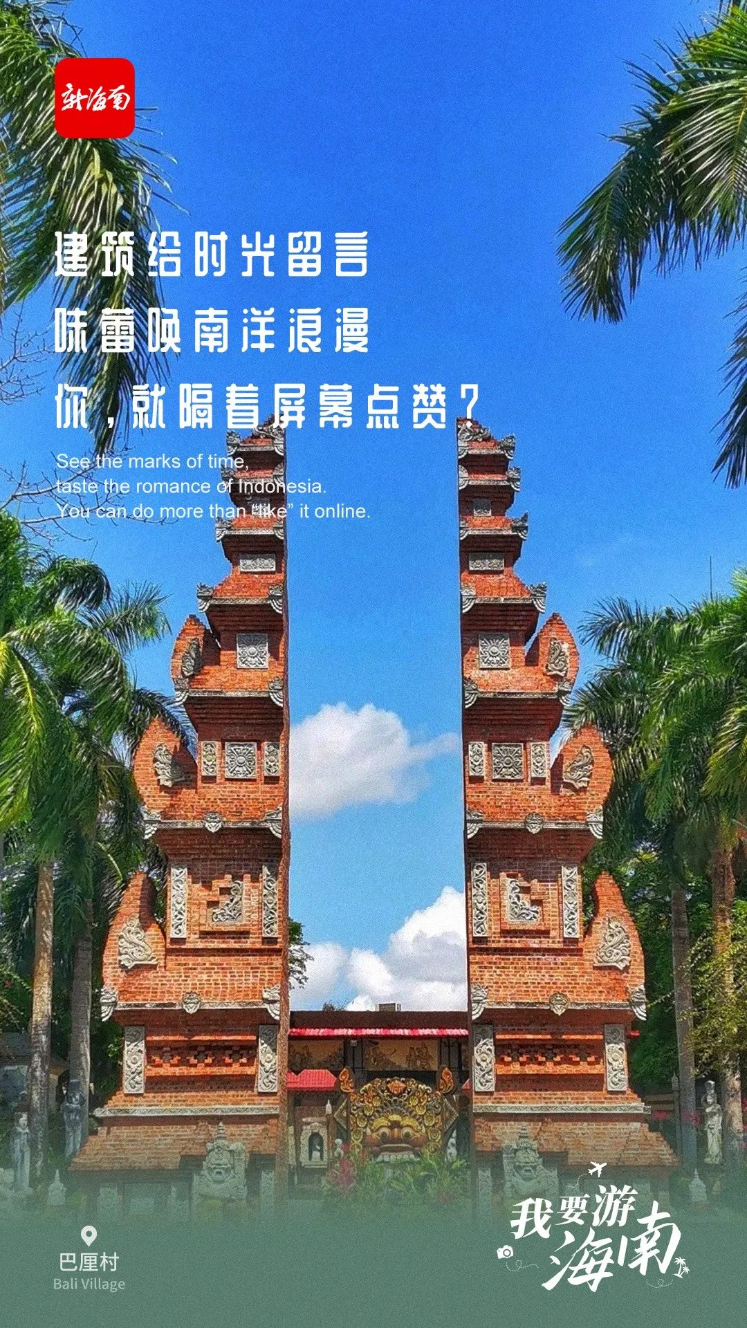 海南日報海口5月19日訊 (海報集團全媒體中心記者吳春媚)5月19日是中國旅游日。新海南客戶端、南海網、南國都市報、海南國際傳播中心聯合推出創意海報《我要游海南》,盤點海南景色亮麗的寶藏打卡地。這組海報以富有畫面感的“三行情詩”文案、高清精美大圖,充分展現海南旅游的魅力。