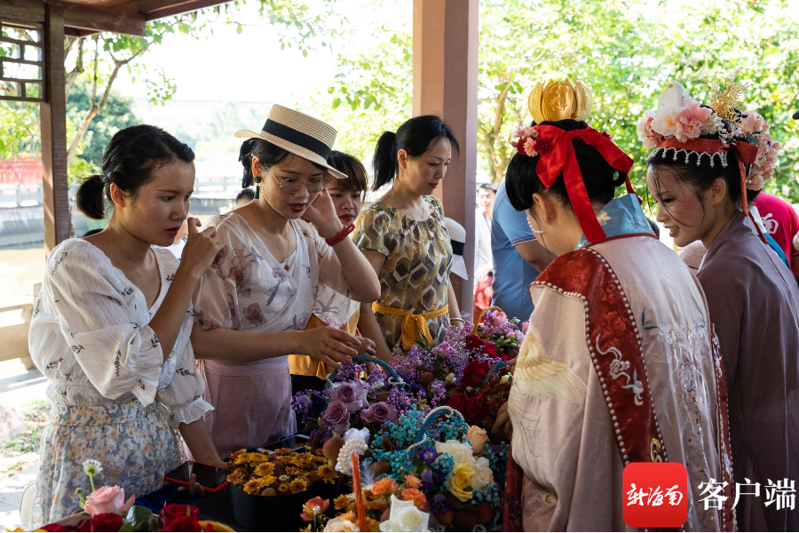 穿著國風服飾的小姐姐展示荔枝花藝果籃。記者 李昊 攝
