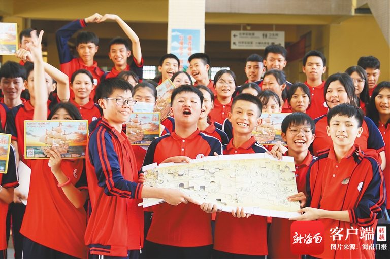 中國(海南)南海博物館“南海文化進校園”研學活動走進海南陵水思源實驗初級中學,學生們拼出《鄭和航海圖》拼圖。錢慶鵬 攝