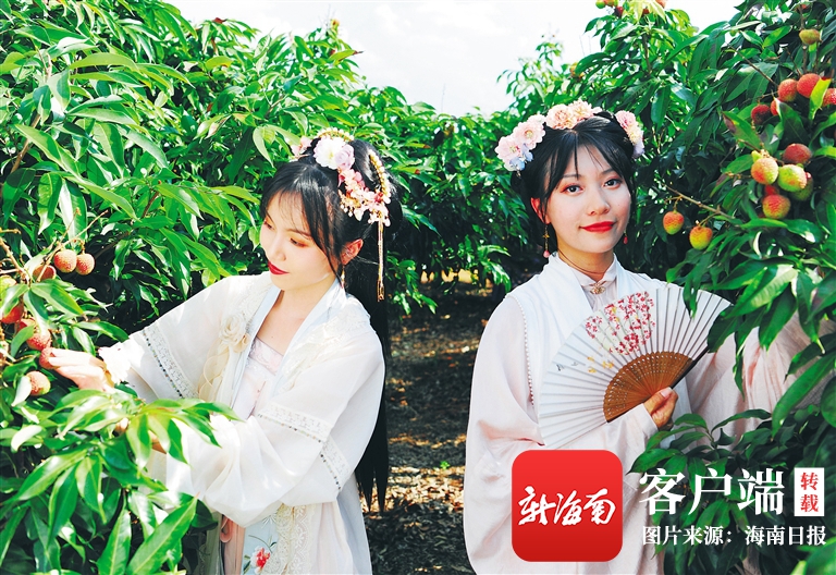 近日,游客穿著古裝在澄邁大豐荔枝采摘園采摘荔枝、拍照。