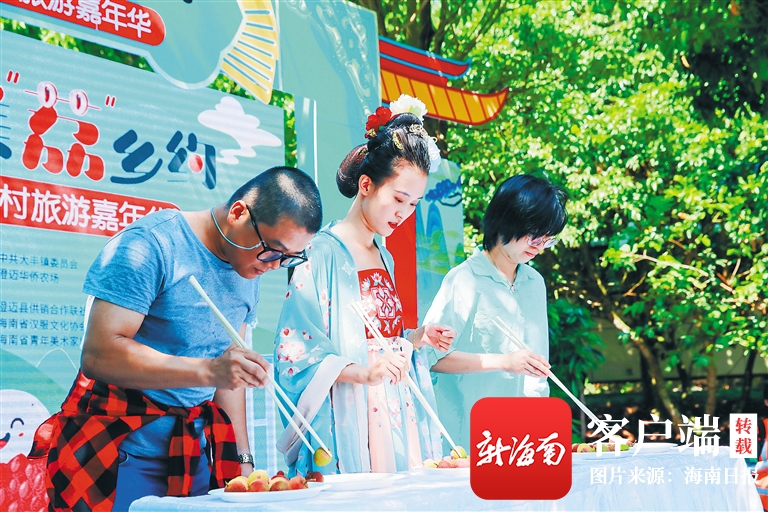 ?近日,在澄邁大豐荔枝鄉(xiāng)村旅游嘉年華活動現(xiàn)場,游客在參加用筷子夾荔枝比賽。 (嘉年華活動主辦方供圖)