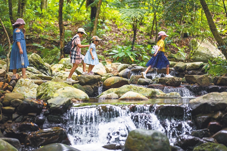 △百花嶺熱帶雨林文化旅游區,游客穿越溪流。海南日報記者 李天平 攝