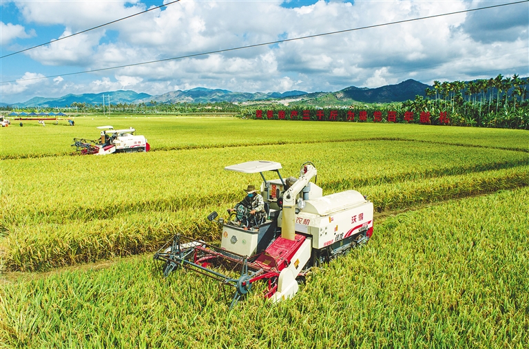 △在三亞市崖州區(壩頭)南繁公共試驗基地,聯合收割機在收割“超優千號”雜交水稻。海南日報記者 武威 攝