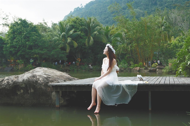 △在呀諾達熱帶雨林,游客享受飽含負氧離子的新鮮空氣。海南日報記者 武威 攝