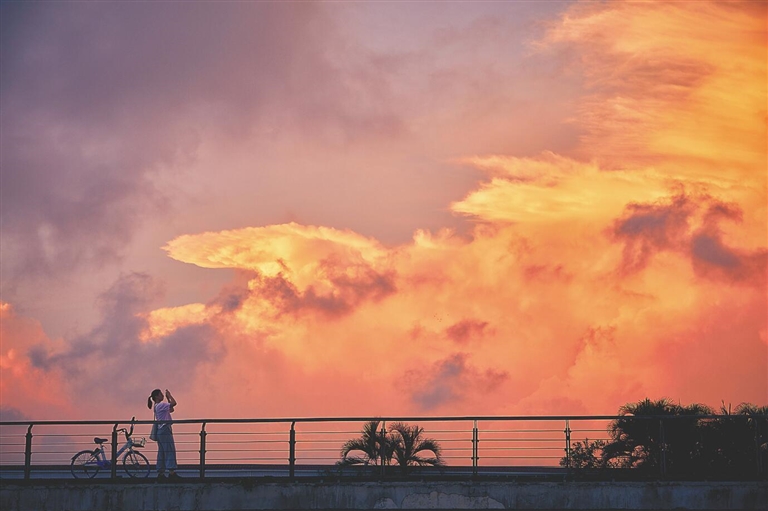 此時抬頭,總能看到大幅的垂天彩云,光影變幻間色彩流動。有時從云端激射出萬道紅光,火燒云氣勢磅礴,如火山巖漿從天際泄出;有時是一片浪漫的粉紅色鋪滿天空,引人無限遐想……這些是屬于海南盛夏的萬種風情。