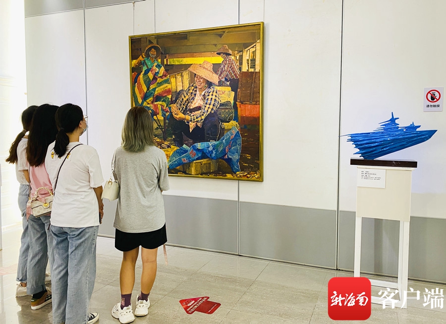 紅色經典美術作品展共展出47名藝術家的近80件藝術精品,展品鱗次櫛比地從門前廣場擺入大廳,呈現了一幕幕史實與意境融合、思想與藝術合一的紅色文化故事。其中畫作40多件,有曾祥熙的《牛嶺朝陽》、潘正沂的《姐妹們》、丁孟芳的《古有花木蘭今有娘子軍》等。雕塑作品30多件,有陳學博的《解放海南》、黃黎祥的《永恒的敬禮》等。