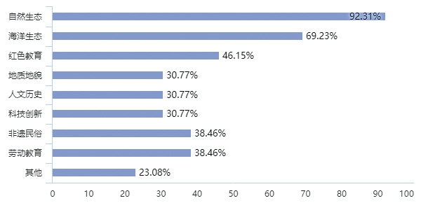 2.課程情況:海南省內研學機構在設置課程主題上對本土特色元素尤為鐘愛。研學機構最熱衷的三類課程為:自然生態、海洋生態及紅色教育。市場反饋來看,非遺民俗和勞動教育同樣受歡迎。