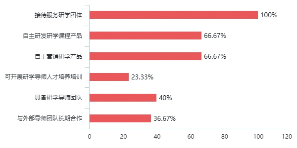 2、運營能力:參與調研的研學基地具有良好接待能力,且大部分能接待較大規模的研學團體。但目前只有40%的基地擁有獨立研學導師團隊,基地研學導師團隊培養仍是重點提升的方向。