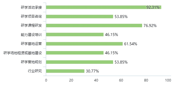1、基本情況:絕大多數的研學機構擁有接待研學團體活動的能力和經驗,研學服務體系相對完善。其中76.92%的機構自主開發研學課程,61.54%的機構有基地運營能力。