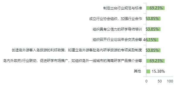 建議島內相關部門出臺行業規范標準,增加高水平培訓項目,落實人才培養計劃,輔助研學機構、基地擴充研學導師數量,提高團隊業務能力。