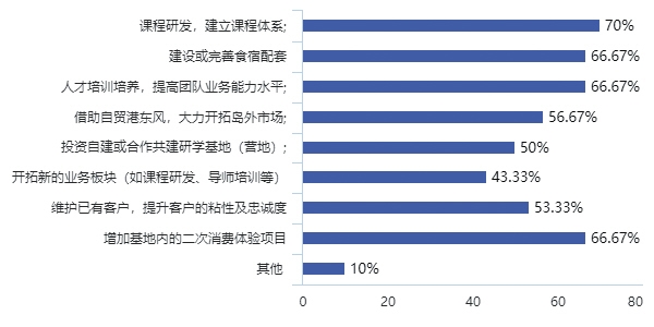建議大部分機構應蓄力加強對外合作,完善研學運營體系和標準;基地完善研學課程體系,加大人才培養,提高團隊業務能力。同時機構和基地也應加強與島外行業間合作聯動。
