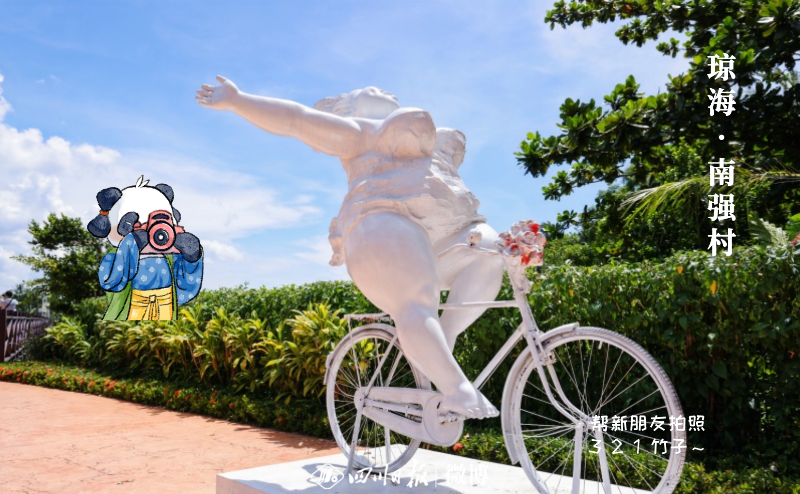 朱軻瑤將到訪的地點進行拍照,再將一些適合的川寶造型P進圖片,所以才有了川寶瓊海南強村吃水果、萬寧鳳凰九里書屋看書等9張明信片。