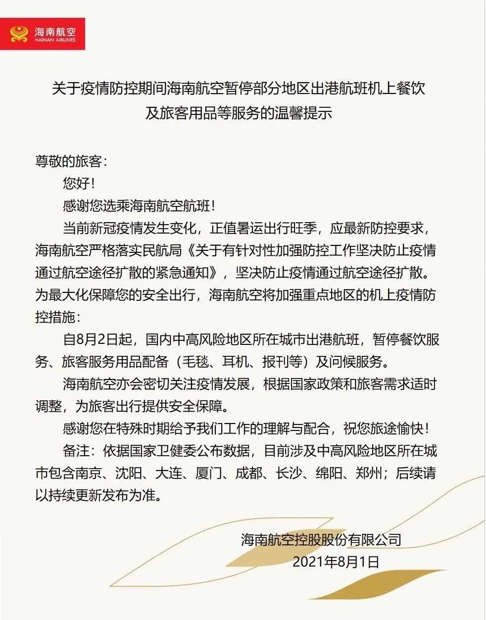 新海南客戶端、南海網(wǎng)、南國都市報8月2日消息(記者 劉洋)8月2日上午,海南航空發(fā)布公告,海航將加強重點地區(qū)機上疫情防控措施,自8月2日起,國內(nèi)中高風險地區(qū)所在城市出港航班,暫停餐飲服務、旅客服務用品配備(毛毯、耳機、報刊等)及問候服務。具體公告如下: