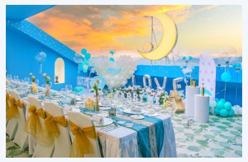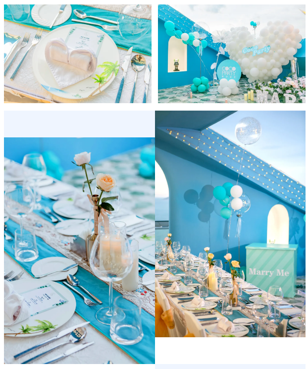 現場布滿了藍白色調的氣球和花藝,
