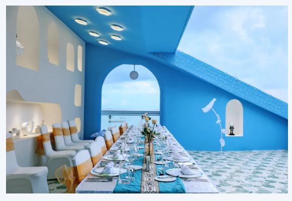 開放式露臺以藍白為主色調,