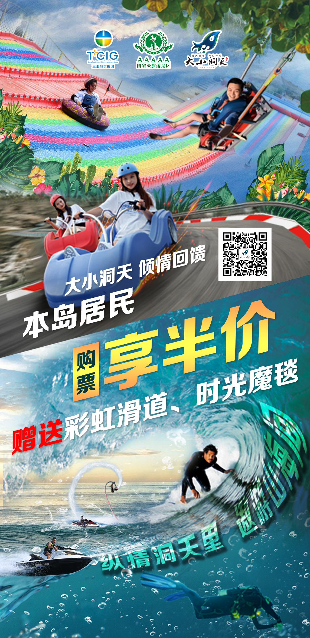 新海南客戶端、南海網、南國都市報8月18日消息(記者 劉麗萍)縱情洞天里,遨游山海間!8月18日,新海南客戶端記者獲悉,日前三亞大小洞天旅游區推出暑期系列優惠活動,本島居民購票可享半價,并贈送“彩虹滑道+時光魔毯”兩個游玩項目。
