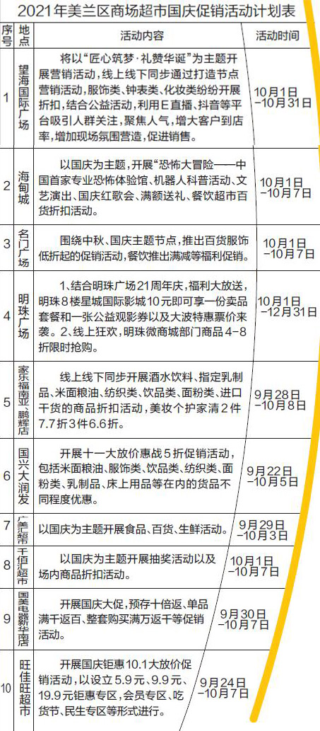 國慶期間,美蘭區多個重點商圈商場推出了系列吃喝玩購活動,包括打折、代金券等優惠購物措施,讓市民游客可以“嗨”翻整個小長假。此外,以“傳龍獅文化 承愛國精神”為主題的海南舞龍舞獅公開賽、國慶滑板滑輪活動將在南亞廣場舉辦。