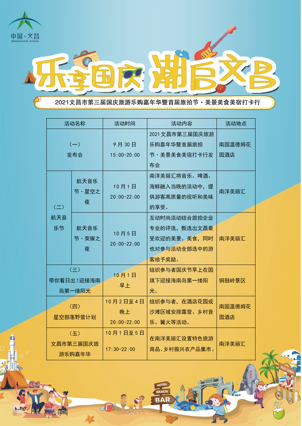 在今年的嘉年華活動中,文昌市將結合航天、濱海等元素的主題音樂節、旅游集市等旅游項目,著力打造一批固定夜間消費體。活動期間,在南洋美麗匯、南國溫德姆花園酒店、銅鼓嶺景區等地將相繼推出“帶你看日出!迎接海南島第一縷陽光”、“航天音樂節”、“星空部落野營計劃”、“樂購嘉年華”等一系列主題活動。