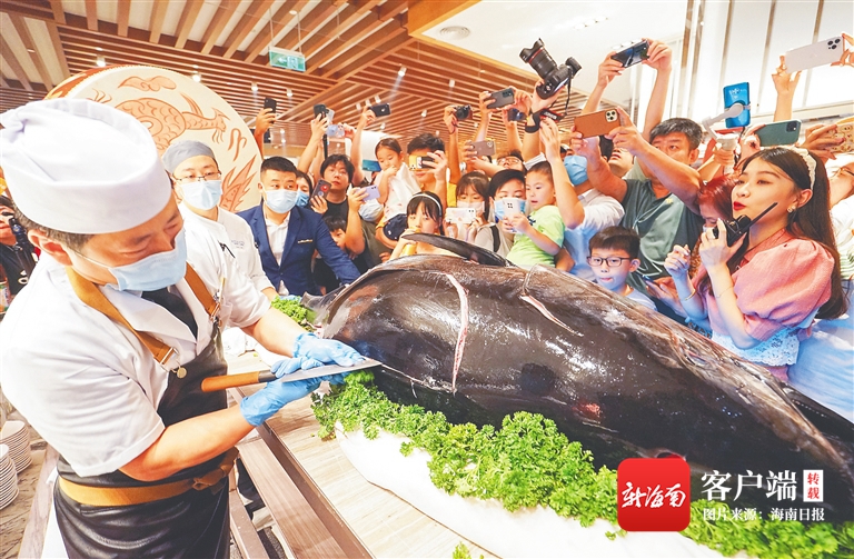 10月3日,在三亞·亞特蘭蒂斯自助餐廳舉行的200斤金槍魚開魚儀式吸引顧客圍觀。 海南日報記者 武威 攝