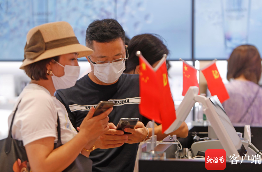 ?國(guó)慶節(jié)游客在海口日月廣場(chǎng)免稅店用手機(jī)付款。記者 汪承賢 攝