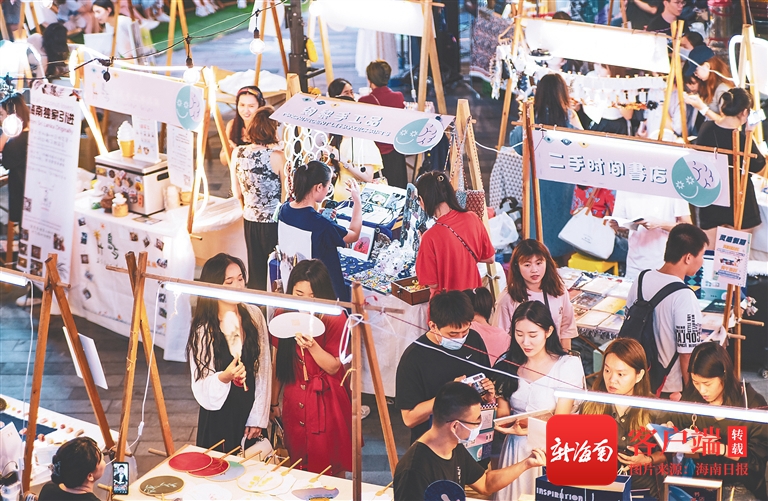 “先逛街,再品嘗海南本地美食?!?日傍晚,華燈初上,桑女士便來到了位于海口N次方公園的“靈感市場”國慶市集。寵物、咖啡、精釀、手作、花藝、攝影、美食、音樂,還有各類手作產品……桑女士穿梭在人群中,流連于各個攤位前?!暗谝淮卧诤?诠涫屑?,商品豐富程度和現場的熱烈氣氛就跟在逛北京上海的創(chuàng)意市集一樣。”她說。
