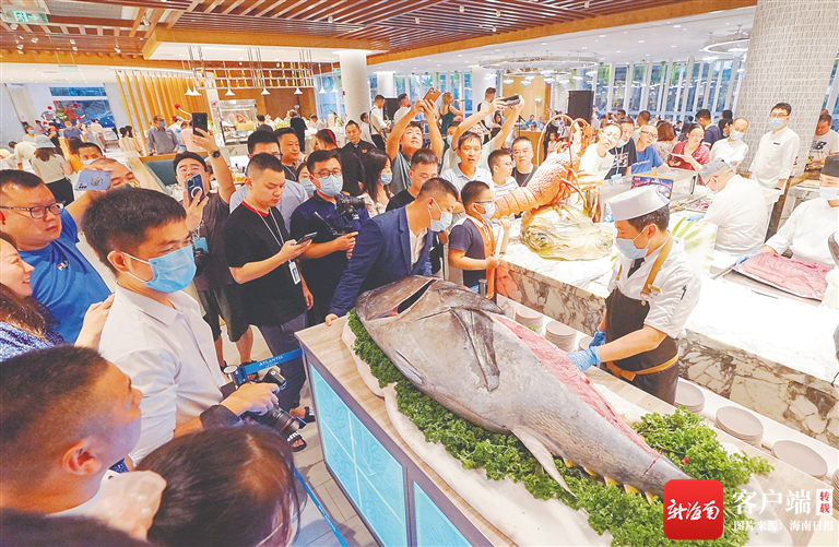 在三亞·亞特蘭蒂斯自助餐廳舉行的200斤金槍魚開魚儀式吸引眾多顧客圍觀。