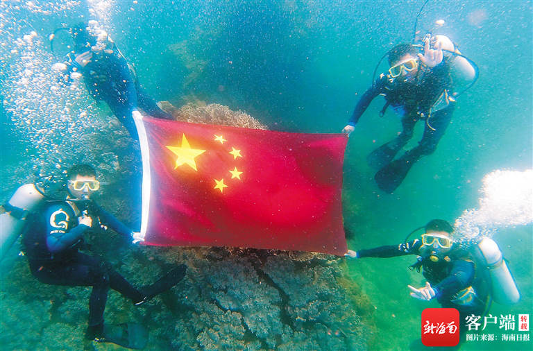 10月1日,在三亞蜈支洲島海域,游客和潛水教練水下展開國旗合影留念。