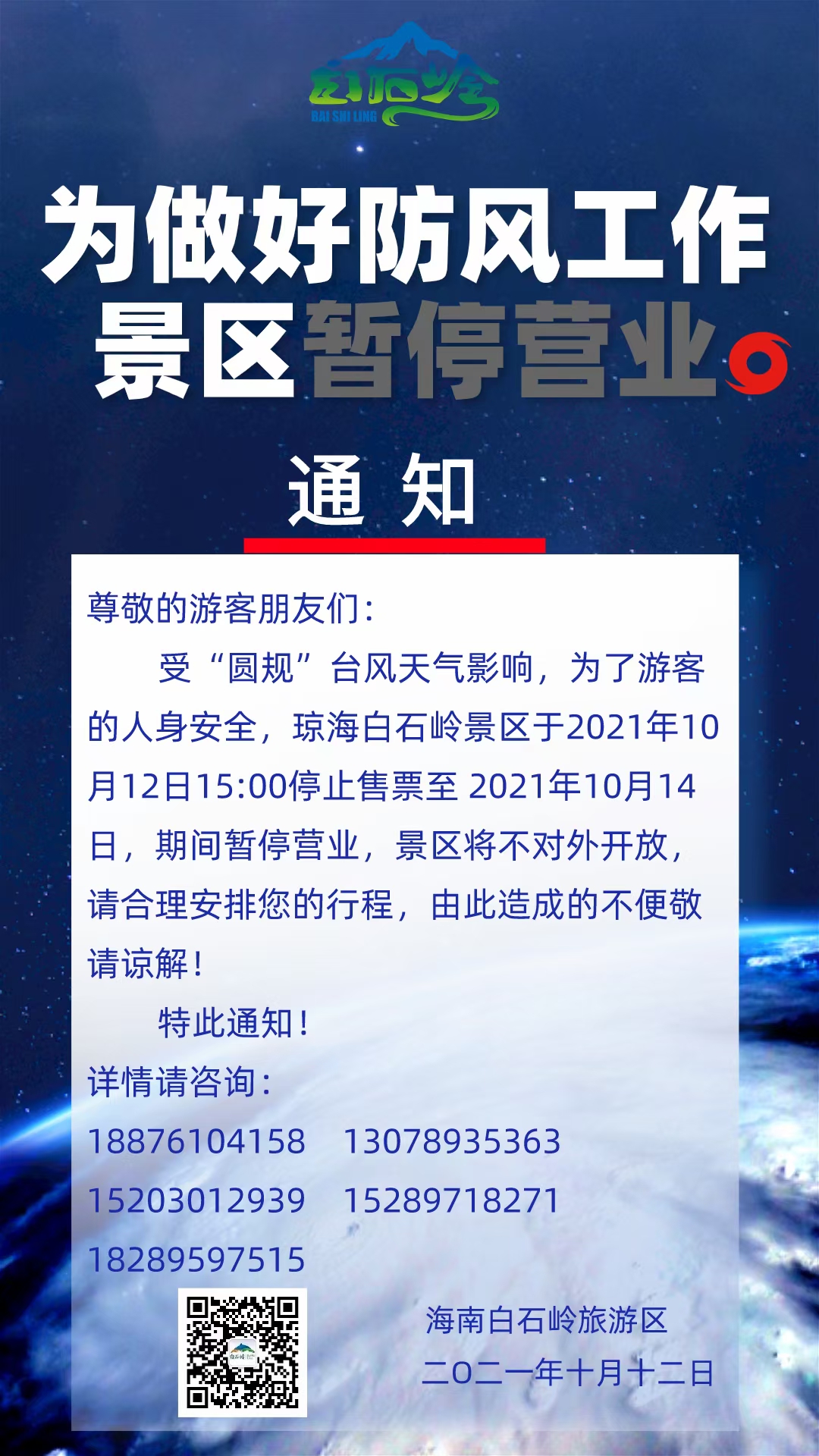 新海南客戶端、南海網、南國都市報10月12日消息(記者蘇桂除)記者從海南白石嶺旅游區了解到,受臺風“圓規”天氣影響,為了游客的人身安全,該景區于2021年10月12日15:00停止售票至2021年10月14日,期間暫停營業,景區將不對外開放,請游客合理安排行程。詳情請咨詢:18876104158、13078935363、15203012939、15289718271、18289597515。