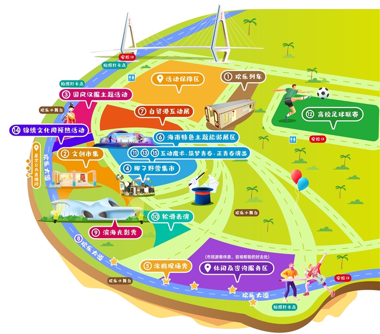 12月10日至12日舉行的椰島歡樂嘉年華中,文創市集、椰子野營集市、國風漢服主題活動、濱海光影秀、濱海涂鴉現場秀等15項活動將為大眾打造全方位的歡樂氛圍。由世紀公園濱海沿線步道打造成的繽紛歡樂大道,有街頭藝人、樂隊的輪番表演,讓觀眾盡情享受歡樂。沉浸式互動體驗場景的“歡樂列車”,更是營造出了市民游客通過“搭乘歡樂列車”即可到達開幕式主會場的感受。值得一提的是,互動魔術魔幻劇《魔法城堡探險之旅》、專屬定制的“歡樂海島·椰椰搖”飲品和“歡樂節”雪糕,將為大眾帶去“看得見、摸得到、吃得上”的極致歡樂。