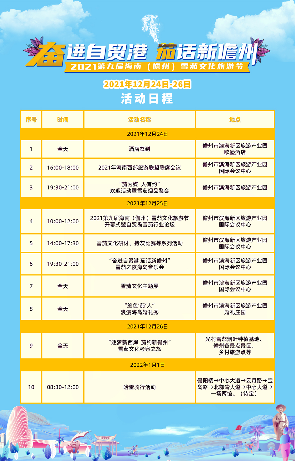 新海南客戶端、南海網、南國都市報12月23日消息(記者 李紹遠)23日,記者從相關部門獲悉,2021年12月25日至2022年1月1日,作為2021年(第二十二屆)海南國際旅游島歡樂節重點活動之一的“奮進自貿港·茄話新儋州”第九屆海南(儋州)雪茄文化旅游節,將于儋州濱海新區旅游產業園舉行。以雪茄為媒的系列活動有八項,包括海南西部旅游聯盟聯席會議、海島音樂會、海島婚禮秀、哈雷騎行等。