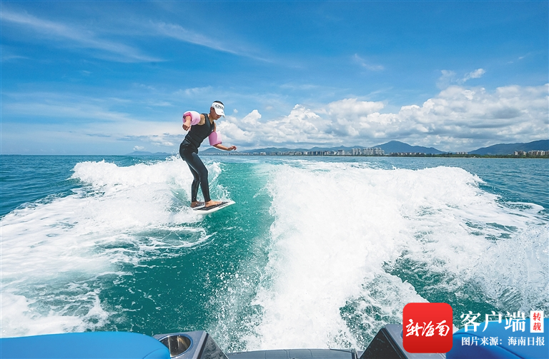 一艘艘五顏六色的造浪快艇快速劃過海面,在造浪快艇的船尾,借助拉繩在造浪上快速滑行,掌握技巧后,拋開繩子,做出各種酷炫的動作……2021年以來,三亞尾波沖浪爆紅網絡,各路明星紛紛前來打卡,有力帶動這一水上運動項目人氣。除了游艇出海之外,尾波沖浪為三亞旅游業再添一道“新名菜”。
