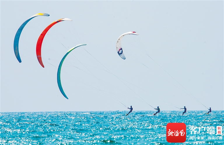 游客在瓊海博鰲體驗風箏沖浪的樂趣?!拔逡弧奔倨冢笈慰蛠淼讲楏w驗海南旅游新玩法。特約記者 蒙鐘德 攝