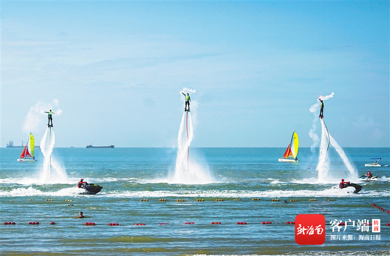 1月5日,三亞崖州灣海洋休閑運(yùn)動(dòng)公園投入試運(yùn)營(yíng),為市民游客提供尾波沖浪、沙灘摩托艇、水上飛龍等“水上、陸地、空中”三棲娛樂項(xiàng)目,提升崖州灣海洋綜合旅游產(chǎn)品的吸引力、競(jìng)爭(zhēng)力。圖為公園試運(yùn)營(yíng)當(dāng)天進(jìn)行的特色水上表演。
