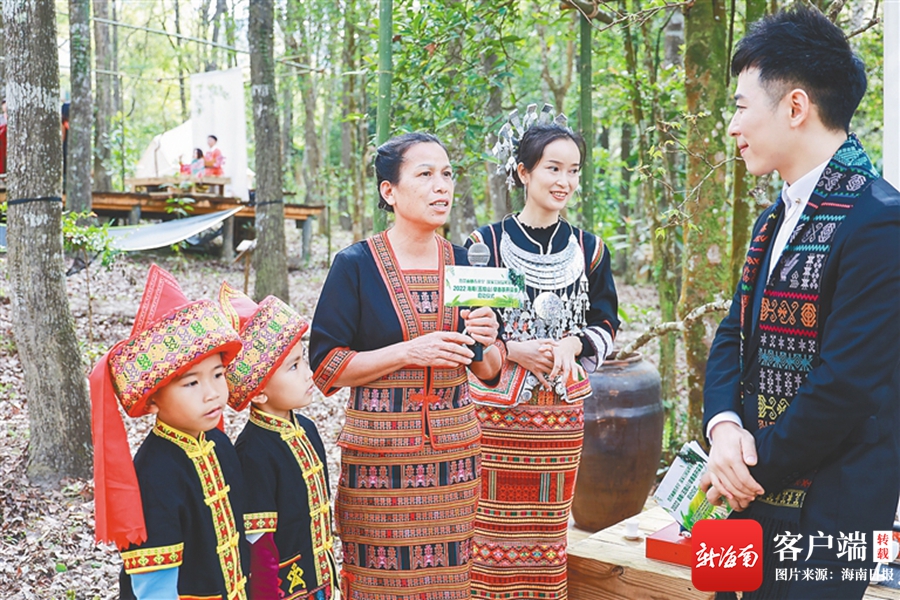 五指山手工制茶人王菊茹(左一)向觀眾介紹手工制茶故事。