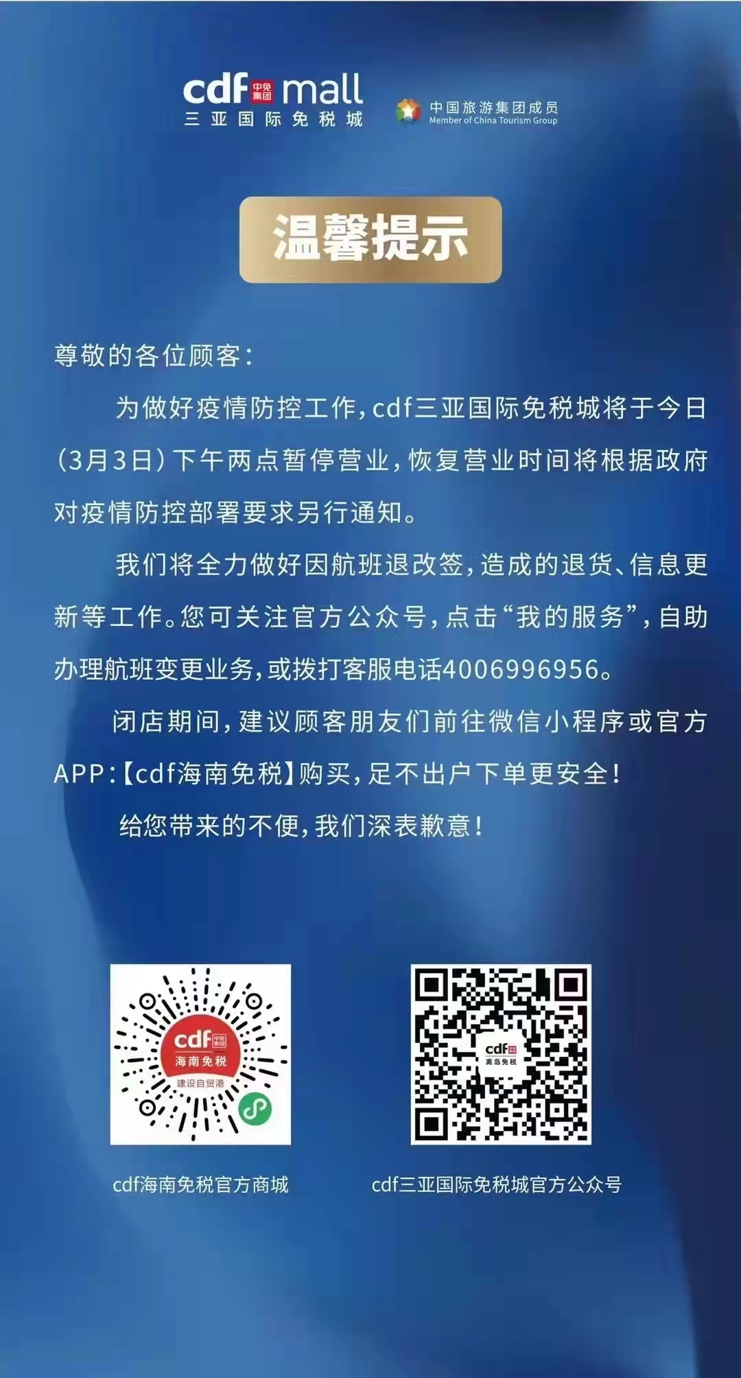 新海南客戶端、南海網(wǎng)、南國(guó)都市報(bào)3月3日消息(記者沙曉峰)3月3日,記者從三亞國(guó)際免稅城獲悉,接三亞市疫情防控及有關(guān)部門通知,因疫情防控需要,三亞國(guó)際免稅城3月3日14:00起暫停營(yíng)業(yè),恢復(fù)營(yíng)業(yè)時(shí)間另行通知。