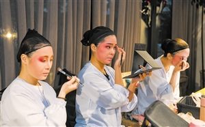 準(zhǔn)備上臺(tái)的演員正在化妝。