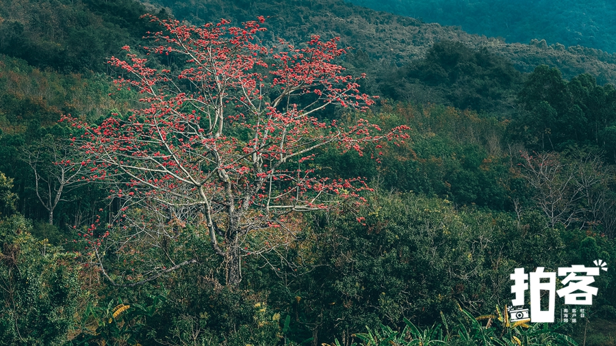 在白沙九架嶺,當(dāng)朝陽撩開薄紗般的云霧時(shí),在綠水青山間,一株株紅火綻放的木棉花宛如在云霧之中披上嫵媚的紅紗。