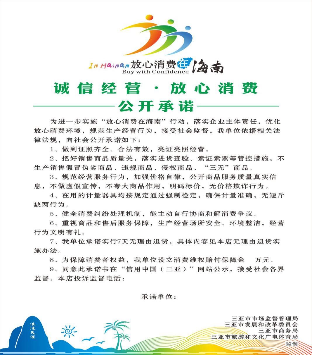 為進一步提升社會誠實守信意識,營造安全放心的消費環境,切實維護消費者合法權益,2021年,三亞市市場監督管理局、三亞市發展和改革委員會、三亞市商務局、三亞市旅游和文化廣電體育局探索四部門聯創機制,聯合開展了“誠信經營·放心消費”創建活動,在大型商店、超市、景區景點、酒店住宿等行業引導市場主體積極參與創建,培育一批消費安全放心、消費質量放心、消費服務放心、消費維權放心、消費價格放心的“誠信經營·放心消費”單位,當前階段共培育的101家市場主體向社會公眾作出了“誠信經營·放心消費”公開承諾。公開承諾內容包含亮證(照)經營、質量安全、明碼標價、公平計量、主動快速處置消費糾紛和重視商品、服務售后服務保障等內容。