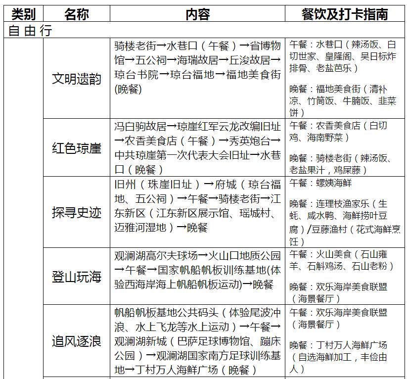 海口市旅行社協會秘書長麥偉文介紹,海口旅文局此次結合常態化疫情形勢下旅游消費市場需求變化,針對游客群體中的青年群體、女性群體、商旅人士和家庭群體,圍繞海口火山、海岸等自然資源和騎樓等人文資源,推出歷史文化游、體育運動游、都市休閑游、美景美食游、網紅打卡游、親子研學游、美麗鄉村游和特色購物游等八大專題自由行線路(含一日游、二日游、三日游)共23條。市民游客可根據時間及需求組合安排,把一日游組合成兩日游、三日游的線路也達百余條。每一個主題線路都是以海口資源情況和不同年齡層次游客需求深入剖析后作出的包裝規劃。