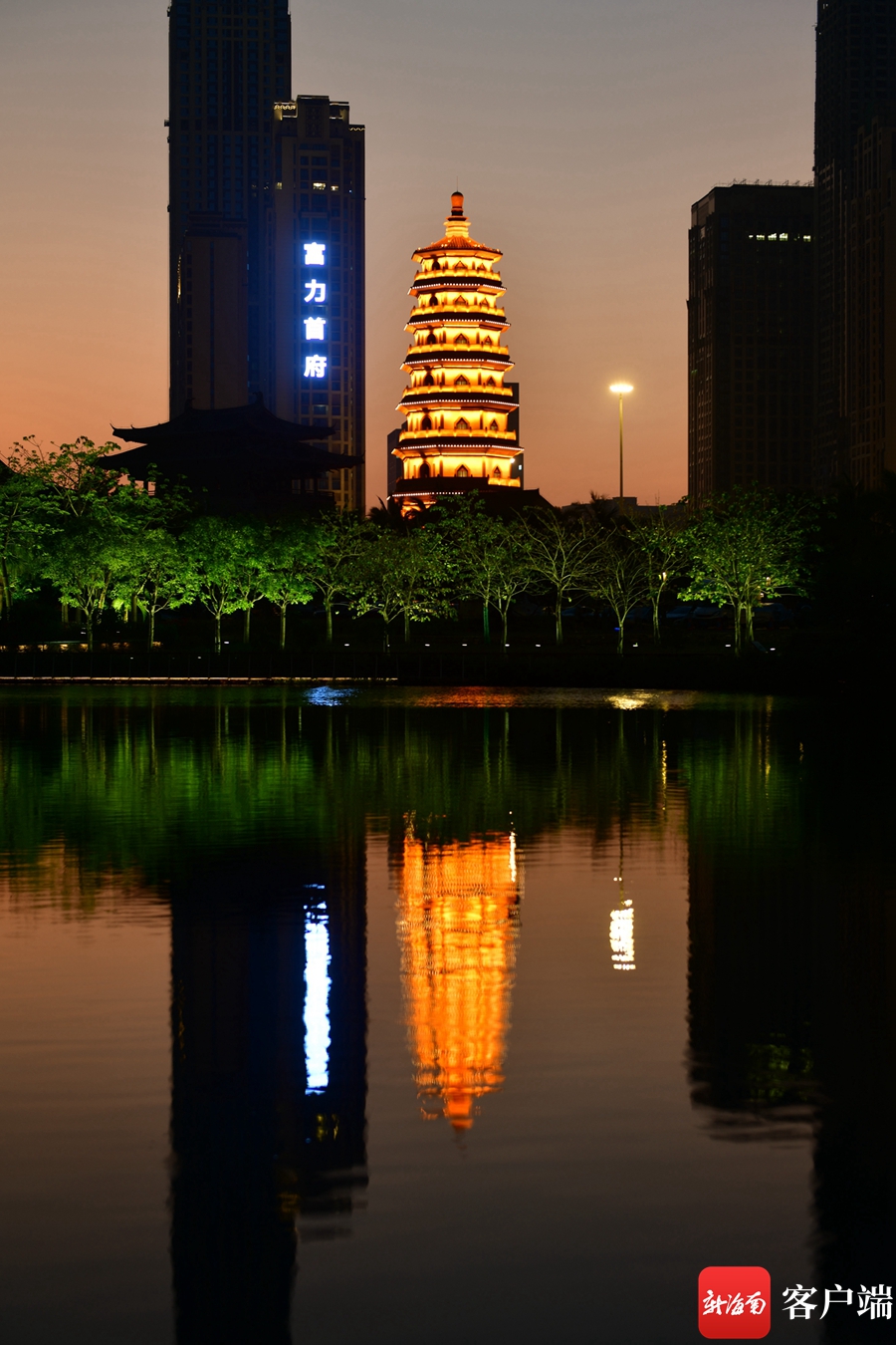 傍晚時分的明昌塔流光溢彩。記者 陳衛東 攝
