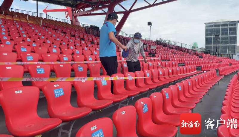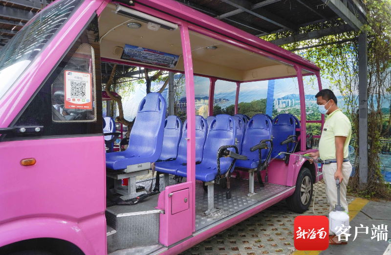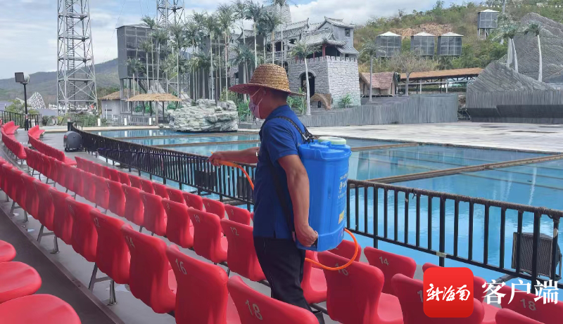 4月21日,三亞絲路歡樂世界工作人員對座椅進行消殺。