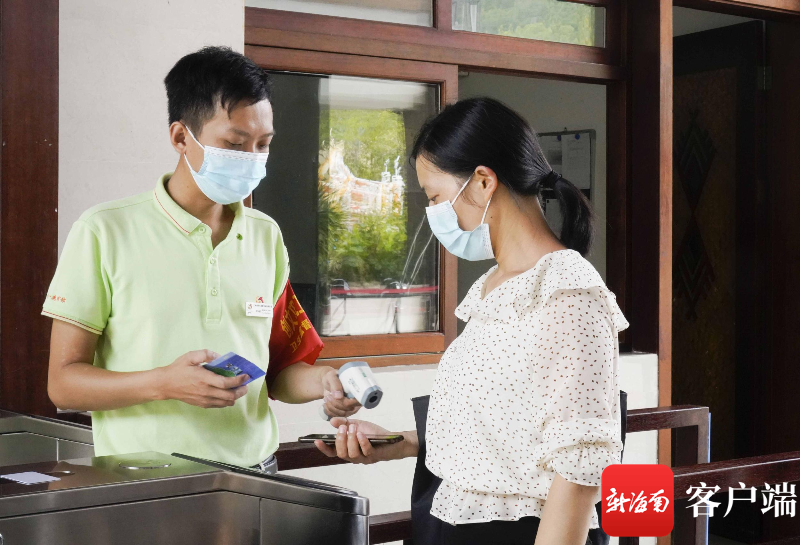4月21日,鹿回頭風景區工作人員給入園游客測量體溫。
