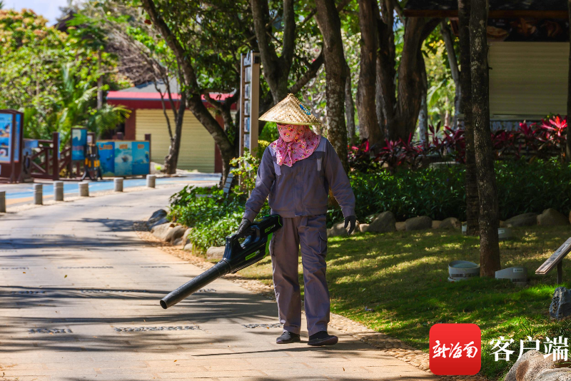 4月21日,天涯海角游覽區工作人員用設備清理路面。