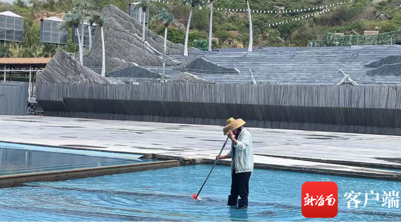 4月21日,三亞絲路歡樂世界工作人員在清理水中雜物。