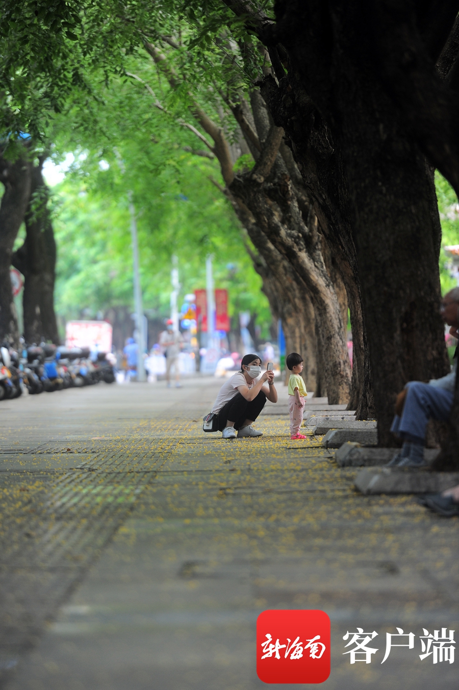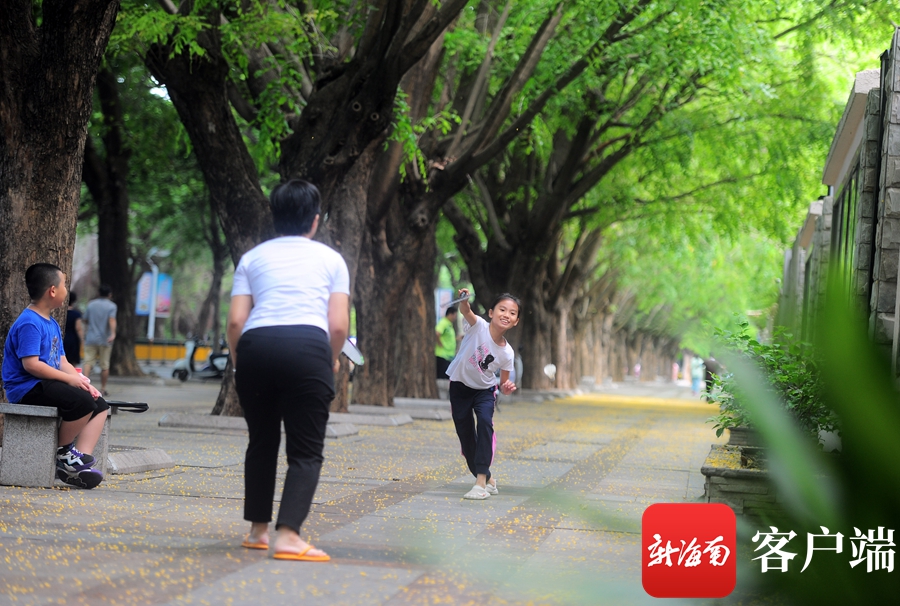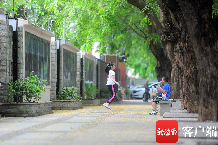 5月4日,市民和孩子在三亞市河東路紫檀樹下玩耍。記者沙曉峰攝