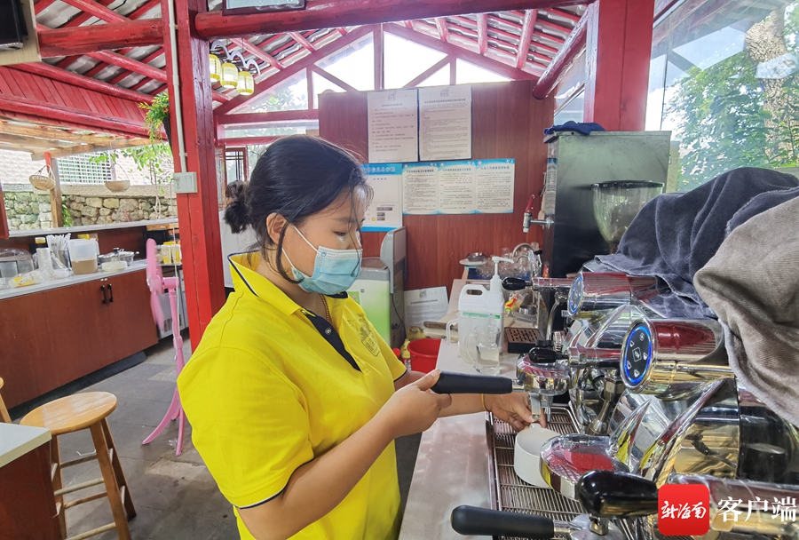 2015年,王凱盈嫁到東英鎮和新村委會頭洋村,平時在家做家務和照顧兩個小孩。2019年,頭洋海堂正式營業后,她和老公一起應聘到這里上班,如今是她是咖啡廳的領班,每月有3000元工資,丈夫是這里的廚師,也能領到3000多元工資。