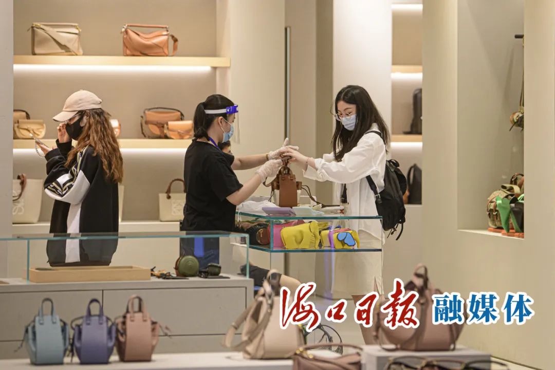 ???谌赵聫V場(chǎng)免稅店內(nèi),消費(fèi)者在選購(gòu)手提包。??谌?qǐng)?bào)記者 陳長(zhǎng)宇 攝