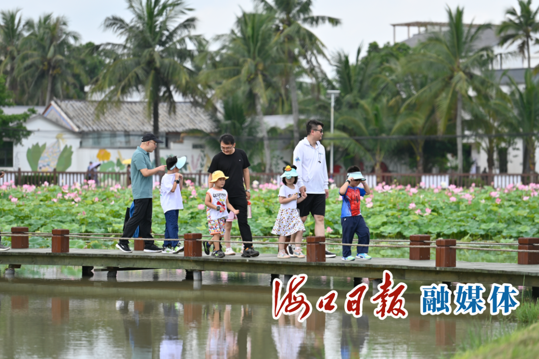5月21日正值小滿節(jié)氣,趁著天氣晴好,市民謝杞沫帶著孩子來(lái)到演豐鎮(zhèn)的??诜紙@國(guó)際藝術(shù)村賞荷花、逛特色民居。